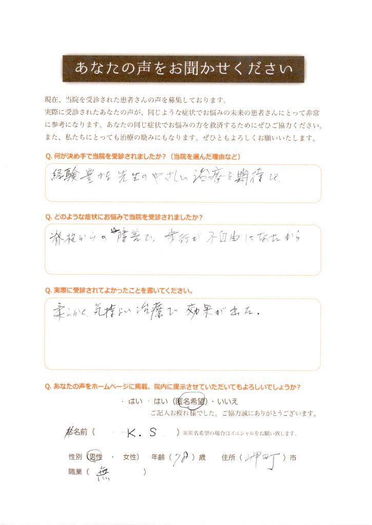 こんにちは。 「小さな刺激で大きな効果を出す。」久保整骨院の院長久保です。 治療を受けられた患者さんの声をご紹介します。 K・Sさん 78歳 男性 泉南郡岬町在住 何が決めてで当院を受診されましたか? 経験豊かな先生のやさしい治療を期待して どのよう...
