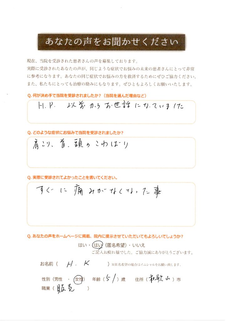 こんにちは。 和歌山市イオンから10分の大阪府岬町で整体治療、鍼灸治療、エネルギー療法、ストレス解放療法をしている久保整骨院の院長久保です。 治療の感想をいただいたので紹介させていただきます。 H・Kさん(販売) 51歳 女性 和歌山市在住 何が決め... -