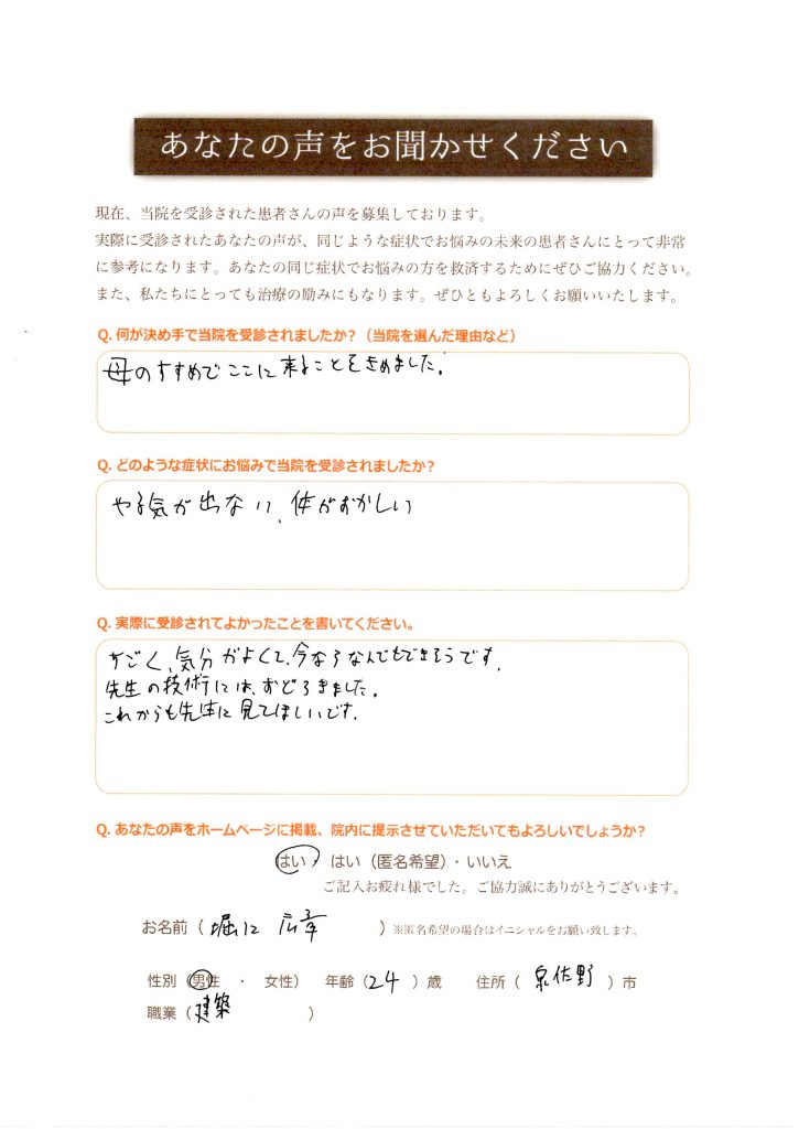 こんにちは! 和歌山市イオンから10分の大阪府岬町で整体治療、鍼灸治療(東洋医学治療)、エネルギー療法、ストレス解放療法、をしている久保整骨院の院長久保です。 当院の治療を受けられた患者さんの声をご紹介します。 堀口 広章さん(建築) 24歳 男性 ... -