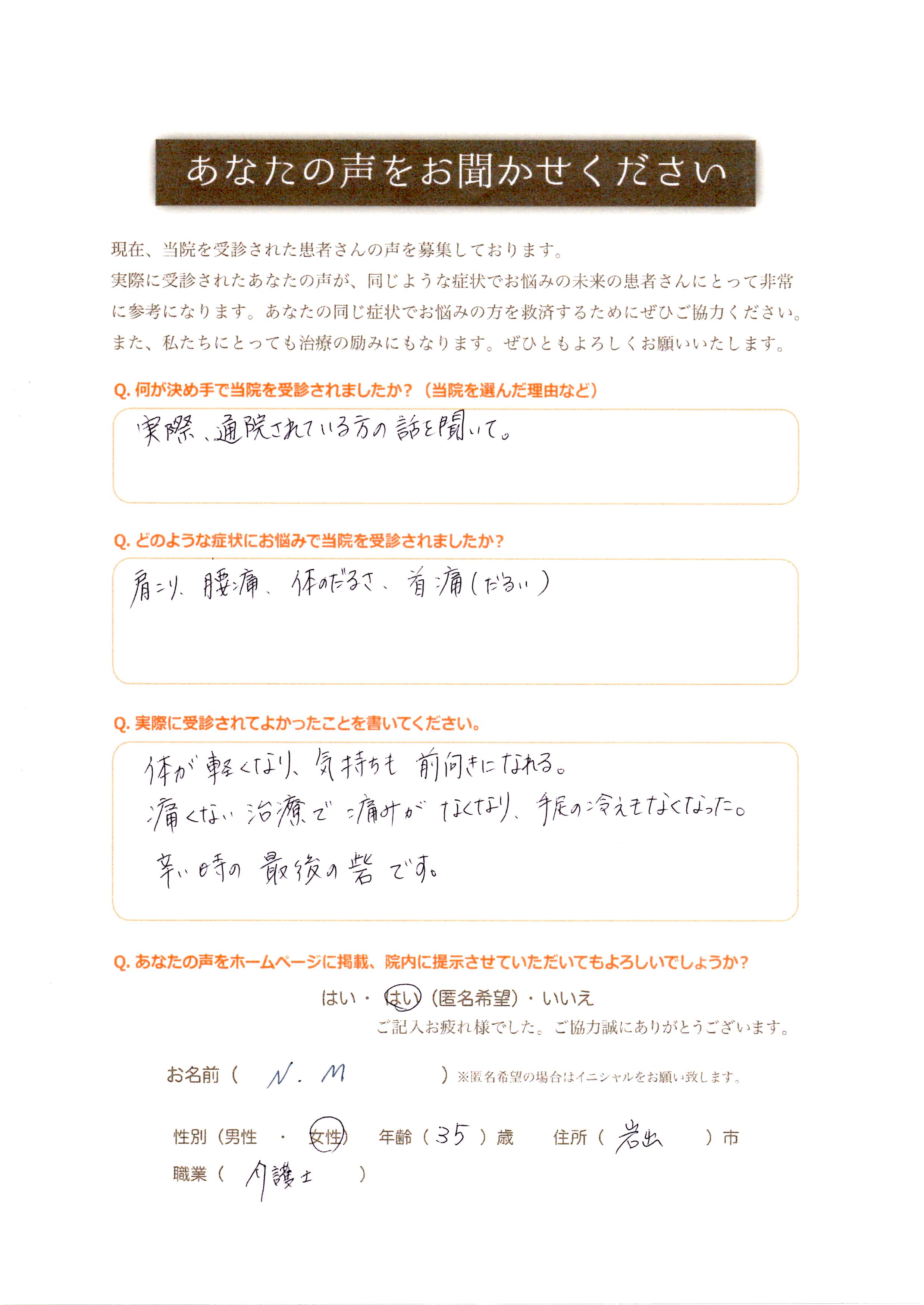 N.Mさん、お忙しいところ治療の感想を快く受けて書いて下さりありがとうございます。