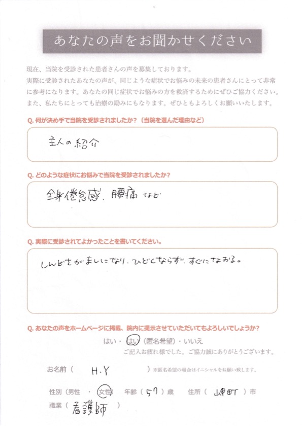 2025年 10月 13日 / 投稿者 院長 久保 / 倦怠感 お名前 H.Yさん 性別 女性 年齢 57歳 お住まい 大阪府泉南郡岬町 ご職業 看護師 何が決め手で当院を受診されましたか? 主人の紹介 どのような症状にお悩みで当院を受診されましたか? 全身倦怠感、腰痛など 実際に受診されて良かったことをお書きください しんどさがましになり、ひどくならず、すぐに治る (柔道整復師・鍼灸師・あんまマッサージ指圧師 久保修一 監修)