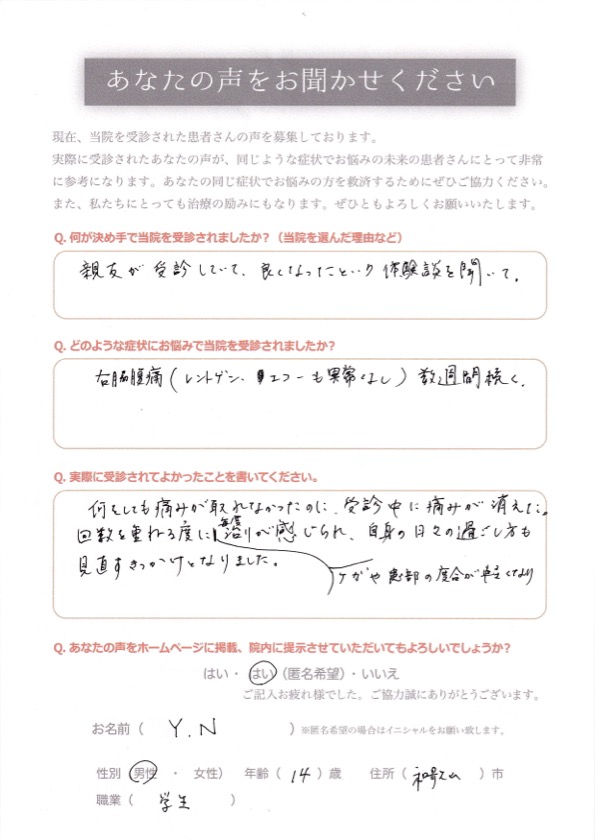 回数を重ねる度にケガや患部の度合が軽くなり、毎度治りが感じられ、自身の日々の過ごし方も見直すきっかけとなりました。