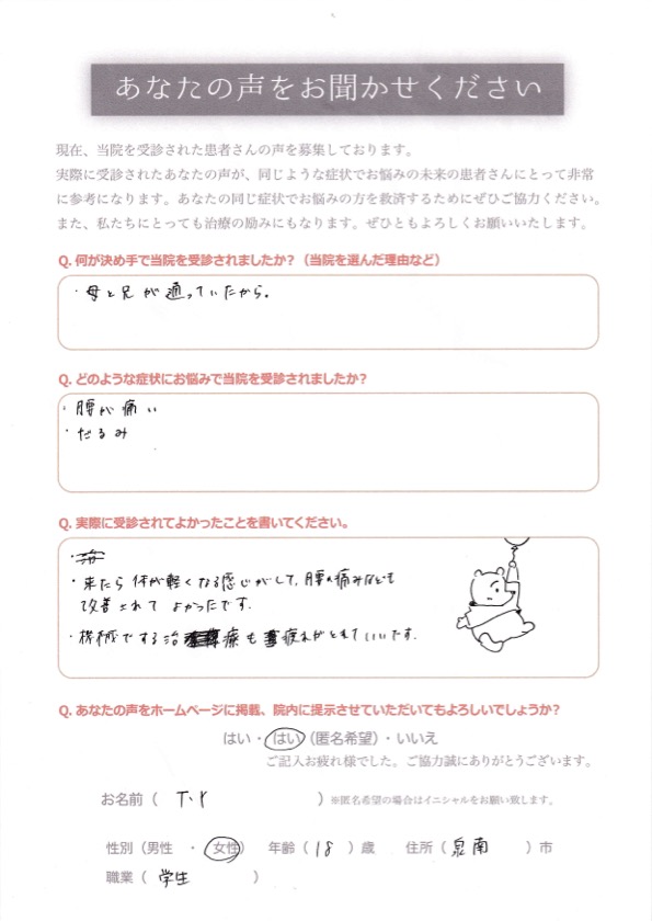 2025年 12月 8日 / 投稿者 院長 久保 / 体のだるさ お名前 T.Yさん 性別 女性 年齢 18歳 お住まい 大阪府泉南市 ご職業 学生 何が決め手で当院を受診されましたか? 母と兄が通っていたから どのような症状にお悩みで当院を受診されましたか? 腰が痛い だるい 実際に受診されて良かったことをお書きください 来たら体が軽くなる感じがして、腰の痛みなども改善されてよかったです。 機械でする治療も疲れがとれていいです。 (柔道整復師・鍼灸師・あんまマッサージ指圧師 久保修一 監修)