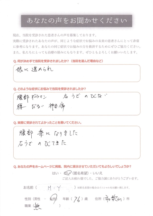 2025年 12月 15日 / 投稿者 院長 久保 / 体のだるさ お名前 M.Yさん 性別 女性 年齢 76歳 お住まい 和歌山県和歌山市 ご職業 無 何が決め手で当院を受診されましたか? 娘にすすめられ どのような症状にお悩みで当院を受診されましたか? 腹部膨満、右腕のびない だるい、神経痛 実際に受診されて良かったことをお書きください 腹部楽になりました。 右腕のびてきた。 (柔道整復師・鍼灸師・あんまマッサージ指圧師 久保修一 監修)