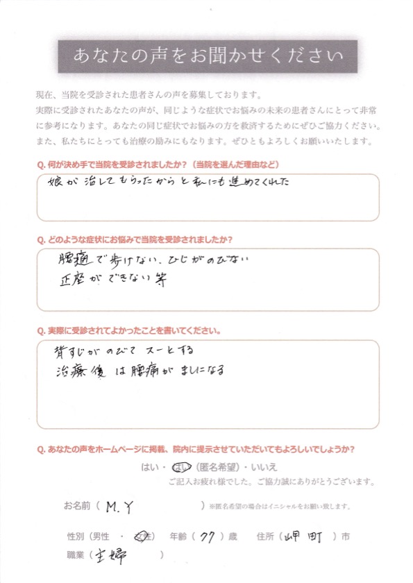 2026年 3月 2日 / 投稿者 院長 久保 / テニス肘 お名前 M,Yさん 性別 女性 年齢 77歳 お住まい 大阪府泉南郡岬町 ご職業 主婦 何が決め手で当院を受診されましたか? 娘が治してもらったからと私にもすすめてくれた。 どのような症状にお悩みで当院を受診されましたか? 腰痛で歩けない、ひじがのびない 正座ができない等 実際に受診されて良かったことをお書きください 背筋がのびてスーとする 治療後は腰痛がましになる (柔道整復師・鍼灸師・あんまマッサージ指圧師 久保修一 監修)